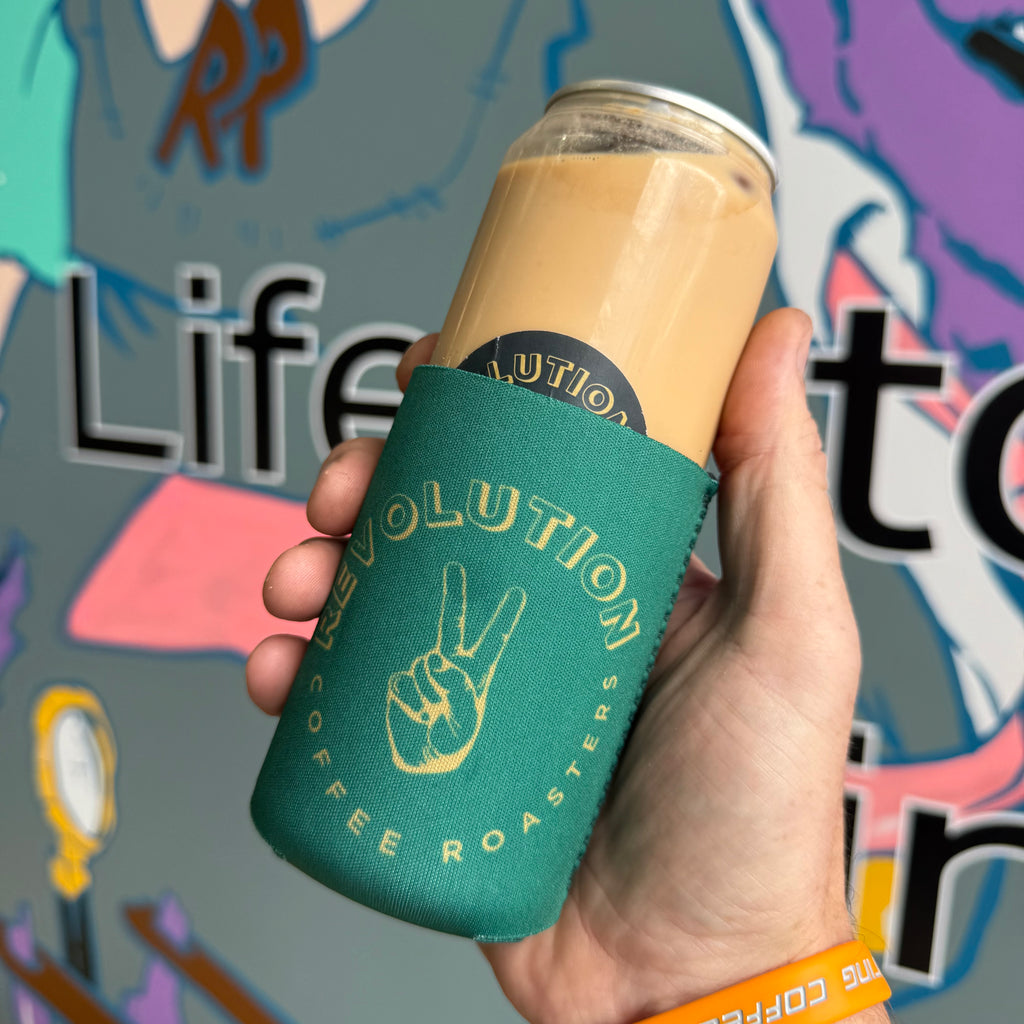 Green and gold branded neoprene cooler fits any can whether its a fresh frothy or an iced latte
